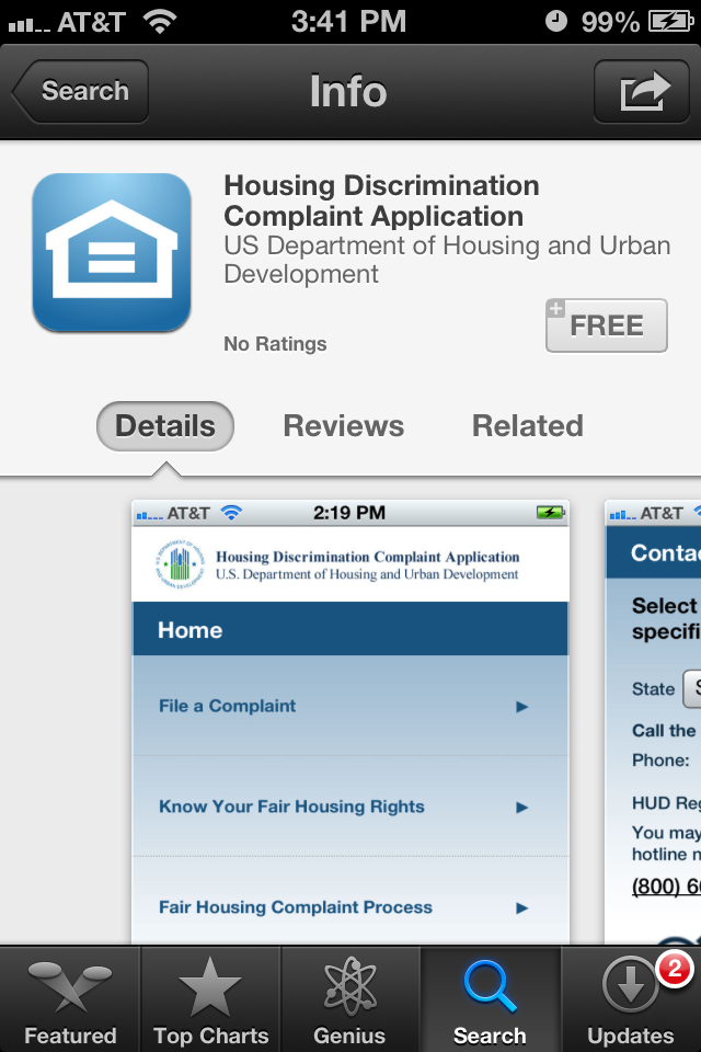 In today’s tech savvy world, residents can access most services and information with the download of an application. The ease and accessibility of an application allows one to take care of an issue and gain information while riding the train to work or on a lunch break. The U.S. Department of Housing and Urban Development (HUD) recognizes the benefits of mobile apps and recently created the “Housing Discrimination Complaint Application” to file housing discrimination complaints. The fair housing app is available for free in the App Store for the iPhone, iPod touch, and iPad. One can find the Housing Discrimination Complaint Application by searching for “fair housing” in the App Store.