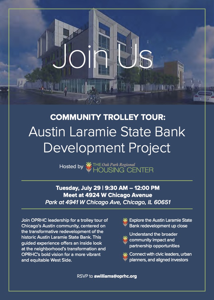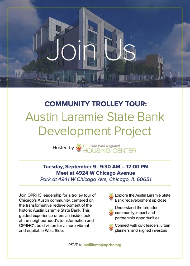 Join OPRHC leadership for a trolley tour of Chicago’s Austin community, centered on the transformative redevelopment of the historic Austin Laramie State Bank. This guided experience offers an inside look at the neighborhood’s transformation and OPRHC’s bold vision for a more vibrant and equitable West Side.